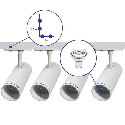 Bright Choice Komplettset 1-Phasen Rail L 1 x 1,5 Meter Weiß | incl. 4x Spot + GU10 2700K 3W Dimmbar + Abschlusskappe, Stromanschluss und L -Verbinder
