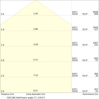 Der Abstrahlwinkel bezeichnet den Winkel, in dem das Licht aus der Lichtquelle ausgestrahlt wird. Er wird in Grad (D) angegeben. Je geringer die Gradzahl des Abstrahlwinkels ist, desto kleiner ist auch der Durchmesser des Lichtkegels, den die Lichtquelle produziert. Beispiel: Wird eine Lampe mit einem Abstrahlwinkel von 60 Grad an der Decke (2,5 m Höhe) angebracht, erzeugt sie einen Lichtkegel von 2,9 Metern Durchmesser. Hat die Lampe hingegen einen Abstrahlwinkel von 120 Grad, beträgt der Lichtkegel 8,7 Meter im Durchmesser. |