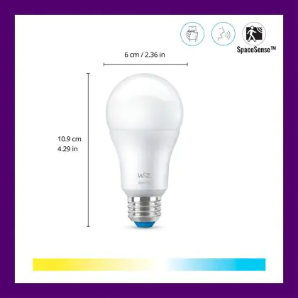 Cette ampoule Pack duo 2x WiZ Smart LED E27 Poire Dépolie 8W 806lm | Meilleur Rendu De Couleur - Dimmable - Remplacement 60W avec son efficacité lumineuse de lumen par watt vous permettra de profiter d’un éclairage de qualité. Avec sa durée de vie de 25000 heures, vous n’aurez pas à vous soucier de son remplacement avant quelques années.